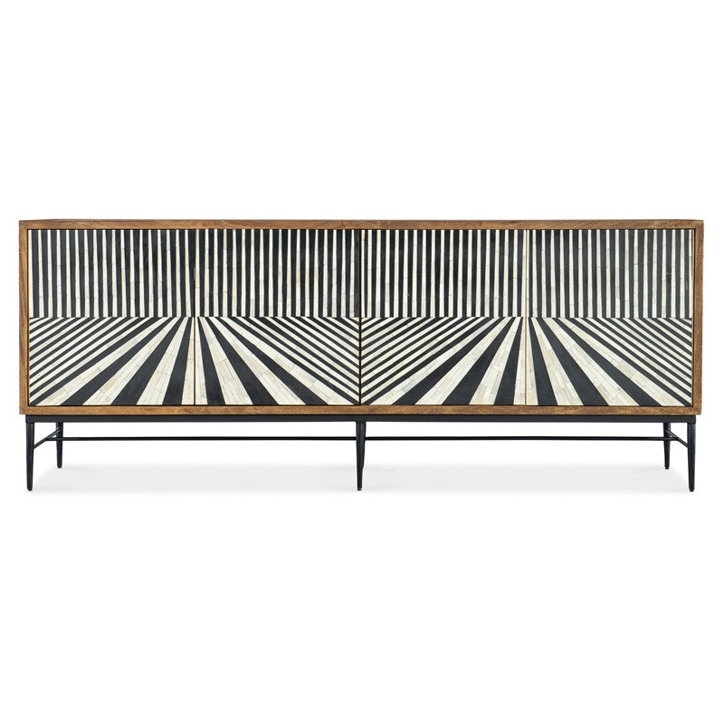 In a classic black and white color scheme with a casual modern twist, the Linear Perspective has a natural medium wood finish over Mango Solid Wood accented by black and white bone inlay on the door fronts and a black metal base. The 4 doors have soft-close hinges and touch latches and one removable shelf is behind each pair of doors. A ventilated back panel with wire management makes the credenza media-friendly.