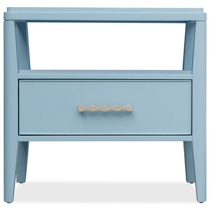 Finished in painted blue with pewter hardware, this nightstand includes one self-closing drawer and open shelf storage.