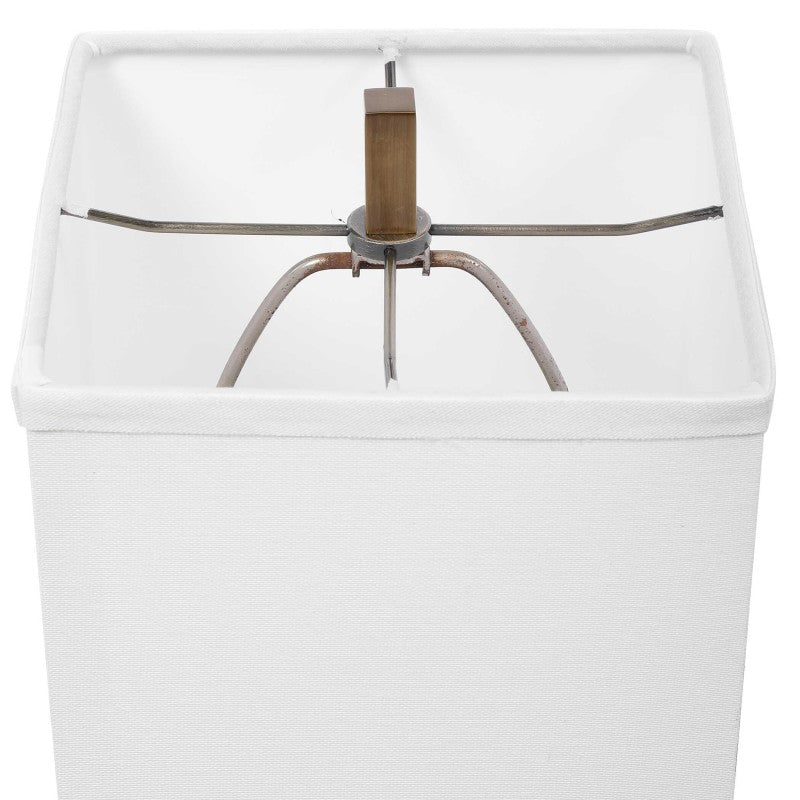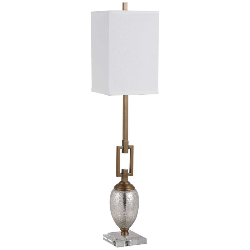 Speckled Mercury Glass Accented With Coffee Bronze Plated Details And A Crystal Foot. The Square Hardback Shade Is An Off-white Linen Fabric.