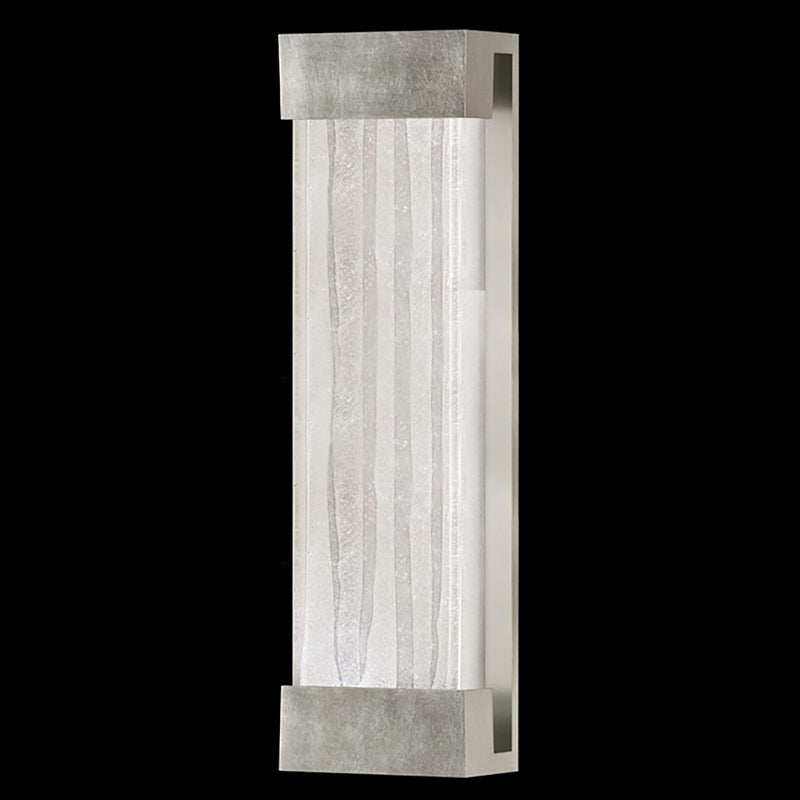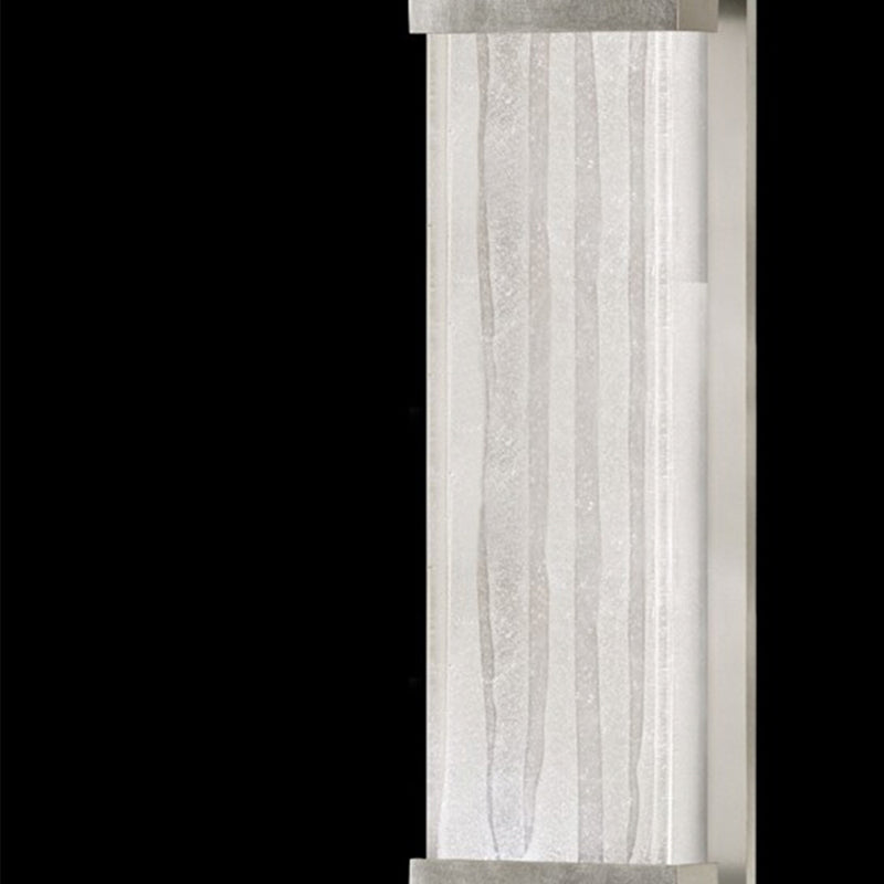 Indoor only wall-mounted art-glass sconce of aluminum in silver leaf finish with handcrafted, polished block of crystal shards. This fixture is photographed with a bright white 4100K bulb(USA). For export, we recommend a 13W threaded CFL. Export configurations are not dimmable.