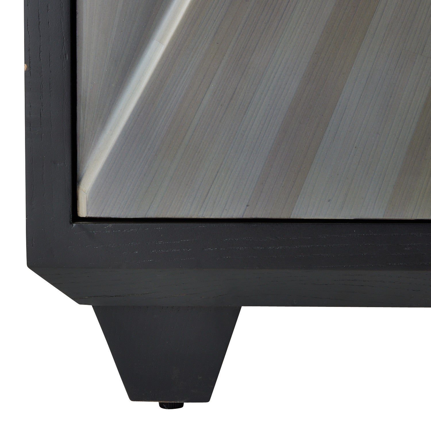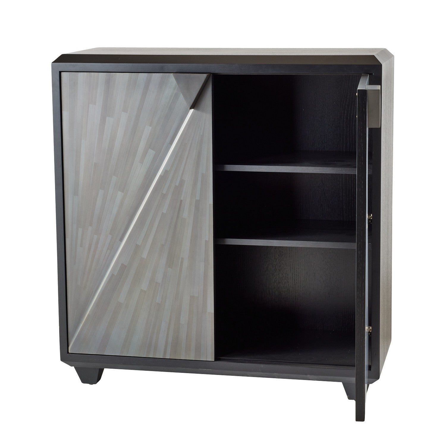 The classic techniques of gray straw marquetry inspired the Ellington. Marquetry made of boiled straw reflects the light, applied in an armor-like faceted patterns. Accented with triangular iron bronze pulls, two doors open to on adjustable hinges to unveil shelving. Framed in ebony oak veneer. Finish will vary. Cabinet