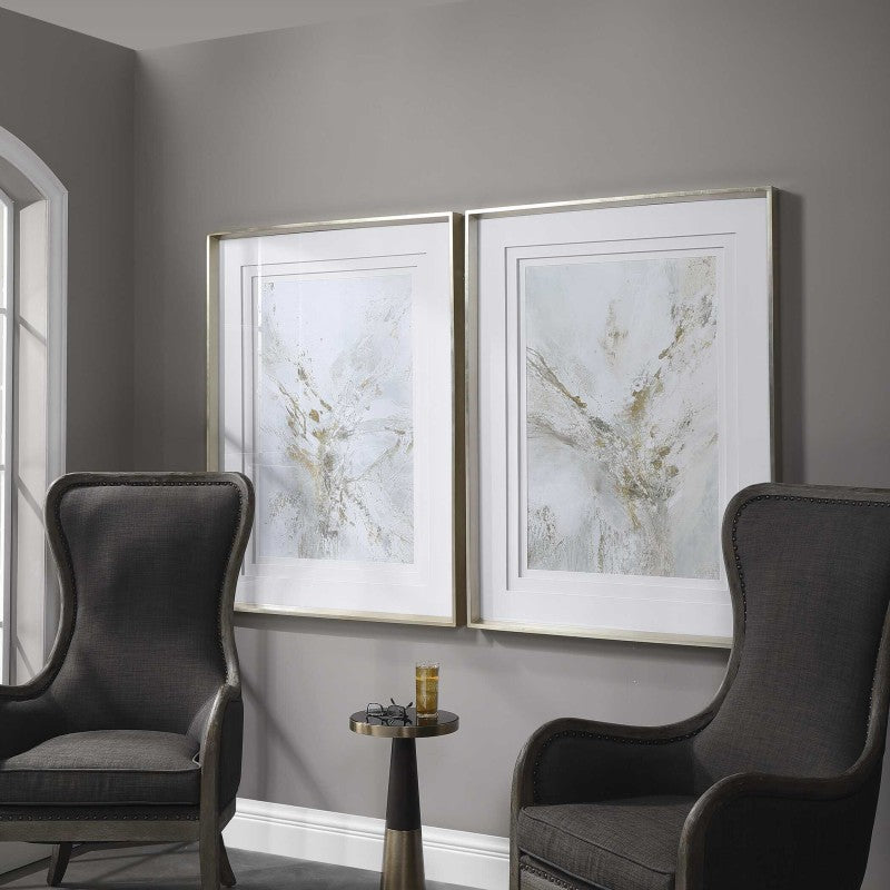 Create An Elegant Statement With This Feminine Abstract Print. The Neutral Artwork Features Shades Of Light Gray, White, And Gold Leaf. Triple White Matting And A Warm Silver Leaf Frame Complete This Sophisticated Piece. Print Is Placed Under Glass. Artwork By Jennifer Gardner.