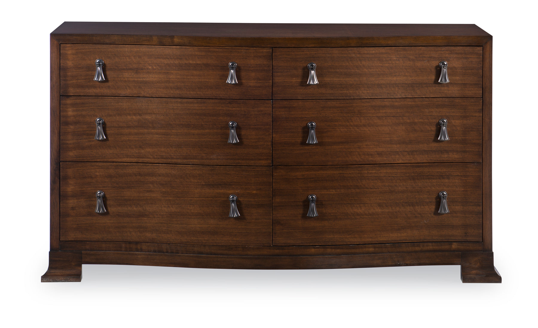 Crafted from Walnut and poplar solids and figured Walnut veneers, the Frasier Serpentine Dresser features a beautiful shaped front, two sets of three large drawers for ample storage each with double placed Pewter finished metal tassel pulls.