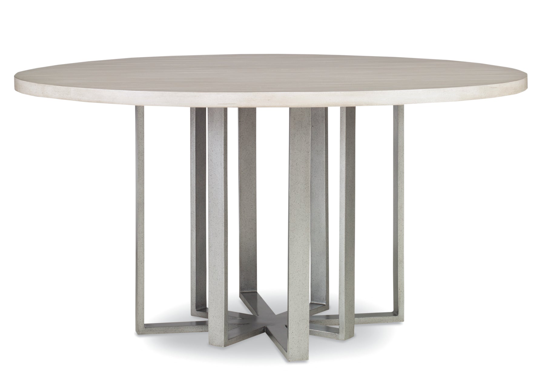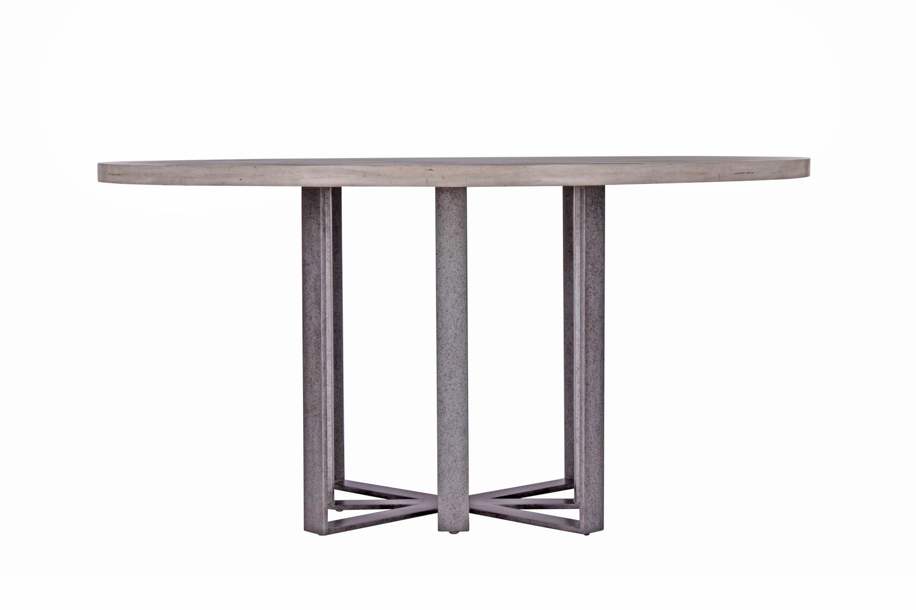 Our Fripp Round dining table is crafted from Mahogany solids and veneers supported by eight interlocking pewter finished straps that drop to the floor meet each other. At 60 radius, this table works as a breakfast room table or small dining table easily seating six.