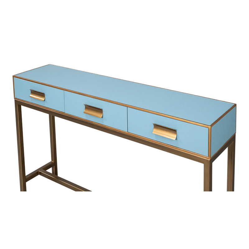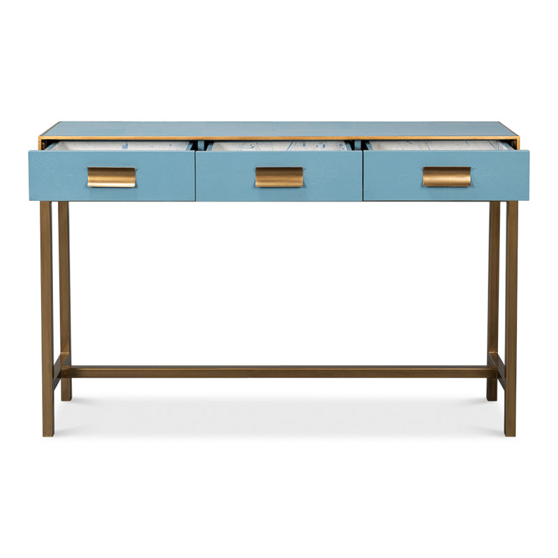 Introducing the Gideon Shagreen Console. Crafted from Wood and adorned with Leather in a Chambray Blue Finish, it features Gold Leather Trim and Gold frame. With dimensions of 54"w x 12"d x 34"h, this console is a harmonious blend of style and functionality. Elevate your living space with the contemporary allure and meticulous detailing of the Gideon Shagreen Console in Chambray Blue, making a bold impact in your modern living space.