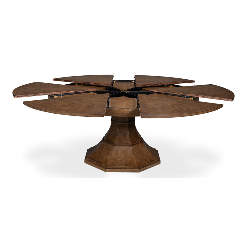 The Giselle Jupe Table exemplifies transitional style. The herringbone marquetry on the top and curved facets of the octagonal base make it a beautiful and functional addition to any dining space. Sarreid's newly reengineered Jupe Dining Tables bring a timeless 19th-century innovation into the modern age. Featuring a self-storing expansion mechanism crafted from extruded aluminum , these tables expand effortlessly, providing both smooth operation and simplified assembly.