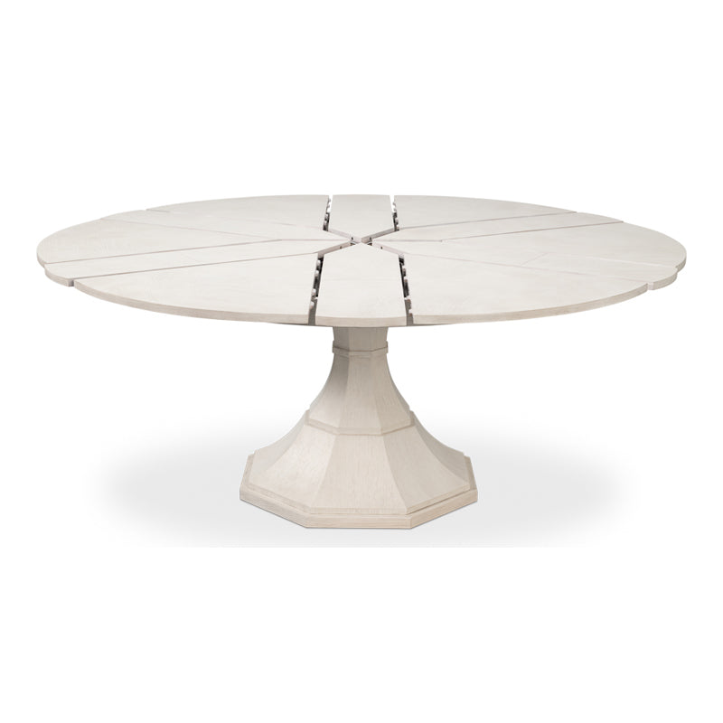 The Giselle Jupe Table exemplifies transitional style. The herringbone marquetry on the top and curved facets of the octagonal base make it a beautiful and functional addition to any dining space. Sarreid's newly reengineered Jupe Dining Tables bring a timeless 19th-century innovation into the modern age. Featuring a self-storing expansion mechanism crafted from extruded aluminum , these tables expand effortlessly, providing both smooth operation and simplified assembly.