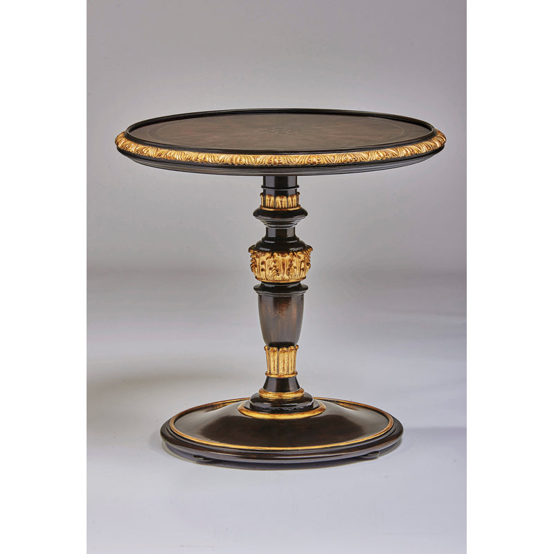 Mahogany Wood end table is ornately adorned with Maple, Walnut, and Ropey Cherry Veneer in Havana finish. Table top features elegant natural wood veneer starburst pattern with inlays forming a Botanical Detail. Aged Gold outlines both the veneer artwork and the trim of the table. Handmade gilded carvings provide unique detail.