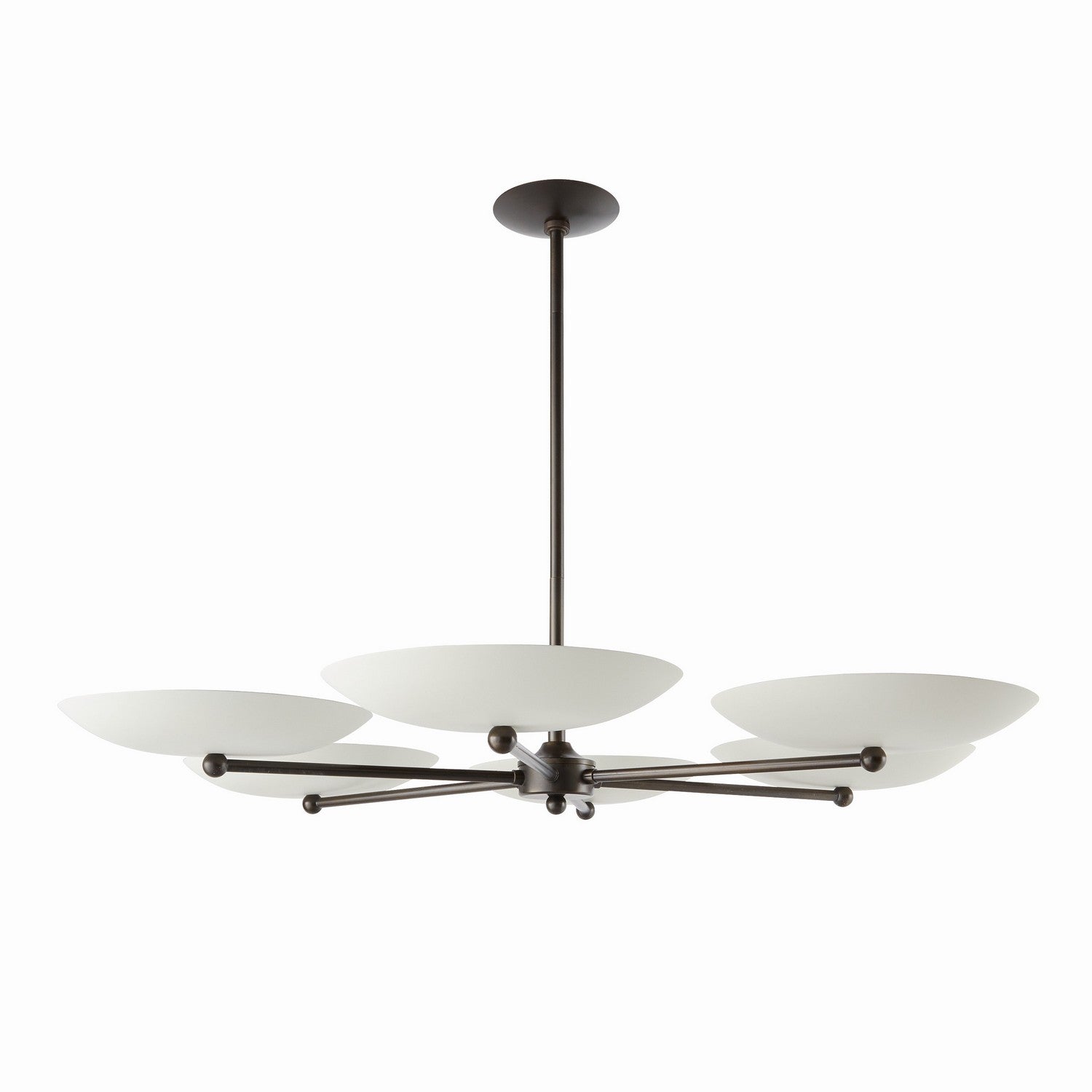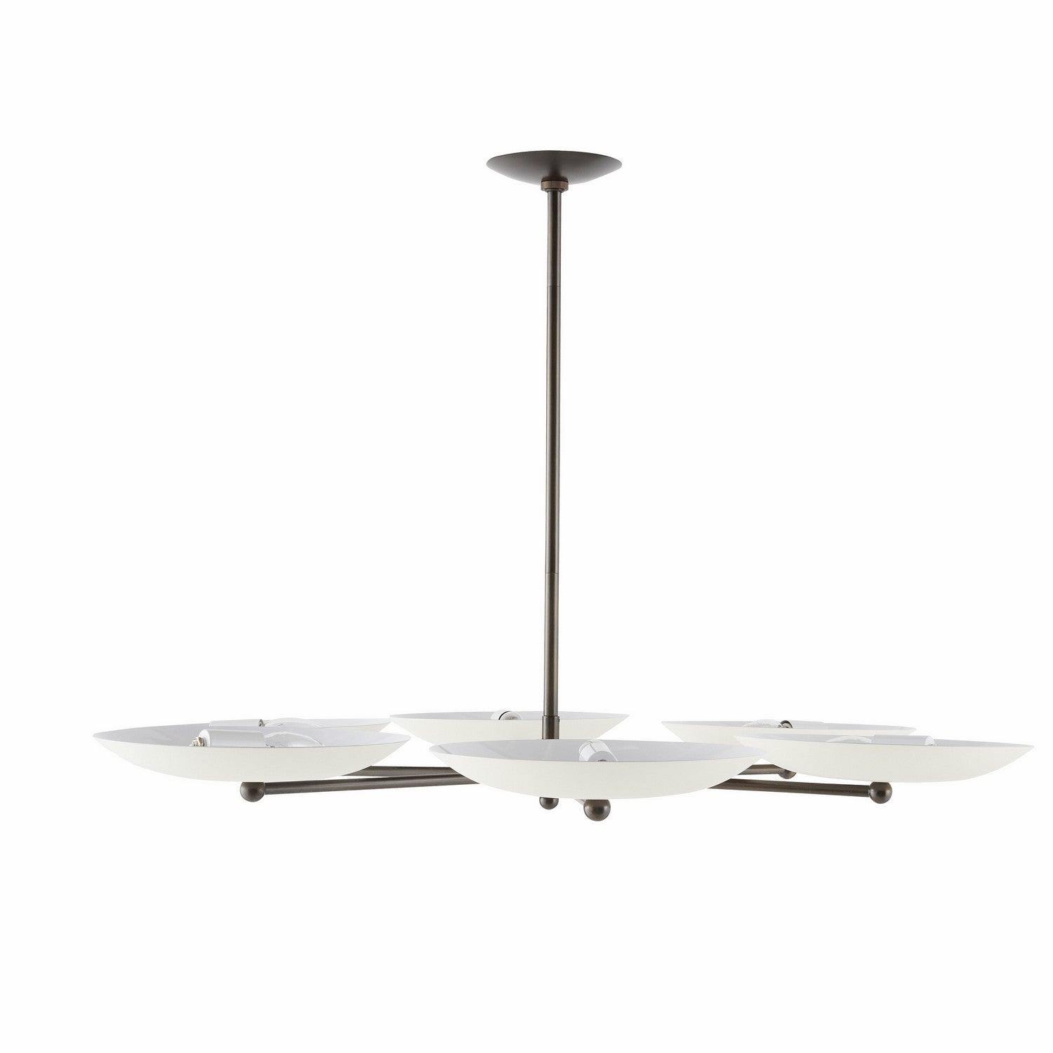 Delicate in nature, the Griffith balances a subtle finish with an elegant English bronze-plated frame. A new twist on a classic, each shade is finished inside and out in a shade of bone steel, then titled upwards to diffuse the light and deliver a warm, even glow. Six Light Chandelier