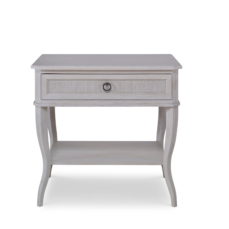 The Hampton’s forms have classic roots that are reinterpreted in a softer, more casual and transitional look. Ash solids and veneers are finished in a soft, chalk stain allowing the pieces to cross design barriers and work in many interiors. This nightstand offers a picture framed drawer with a reeded design and pewter ring pull over an open shelf held by the four delicate tapered legs. The drawer features a soft close mechanism.