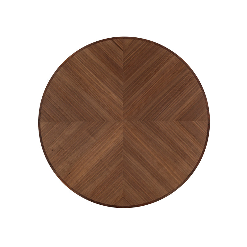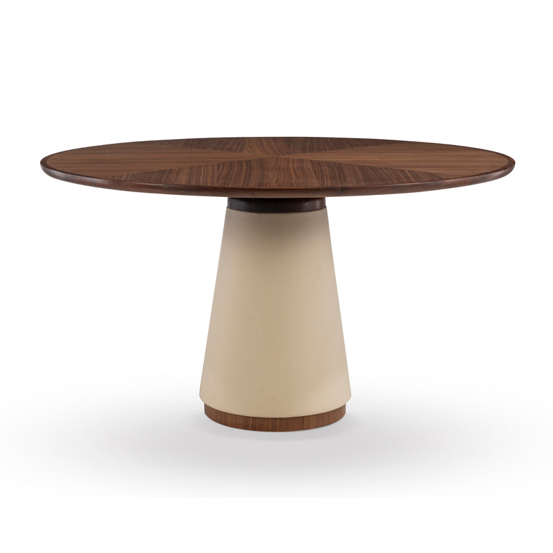Walnut and Leather center table with refined details. Quarter cut Walnut top with trim detailing, and cream leather wrapped base with stitching.