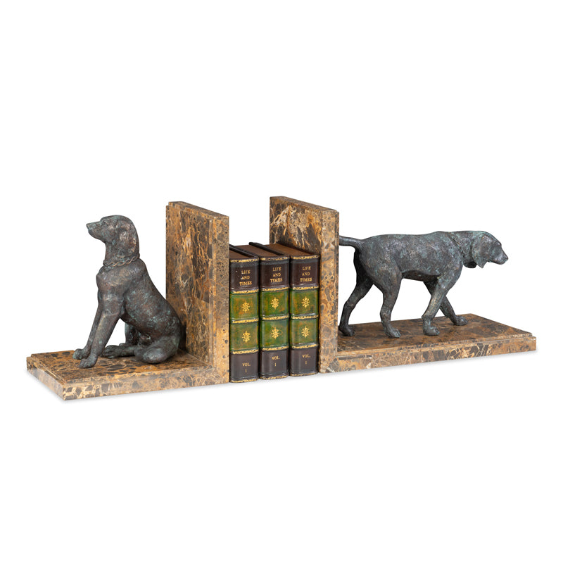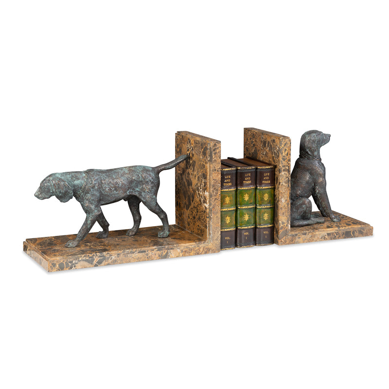 Sculptural hunting dog bookends in solid cast brass, finished in verdigris with snakeskin stone base.