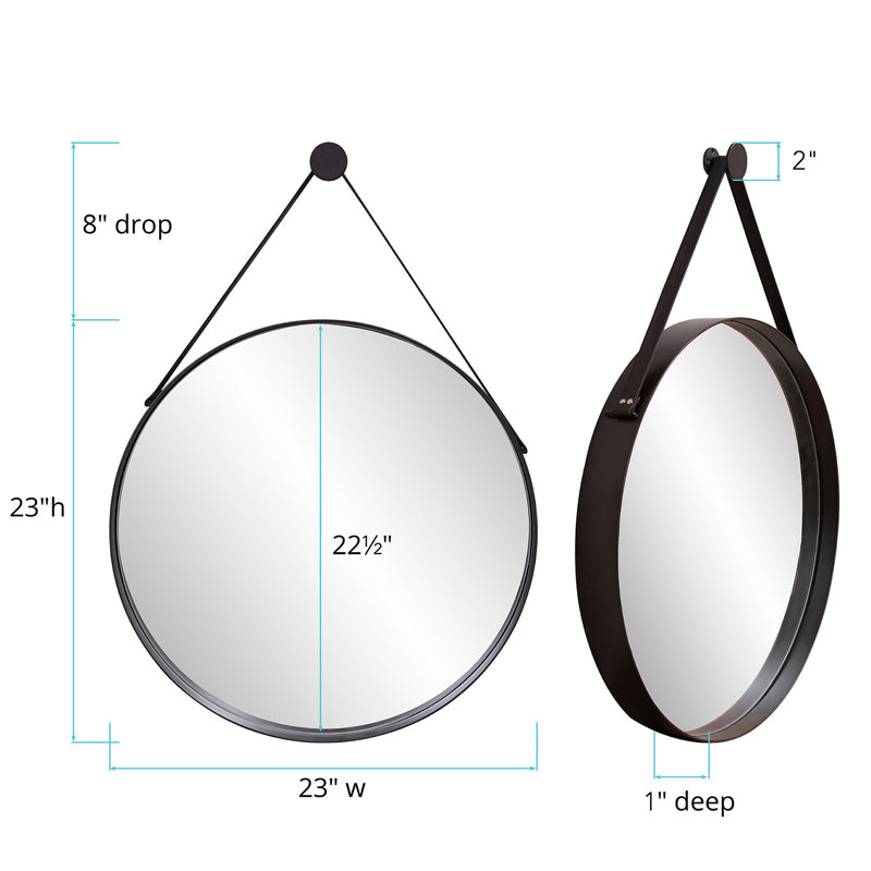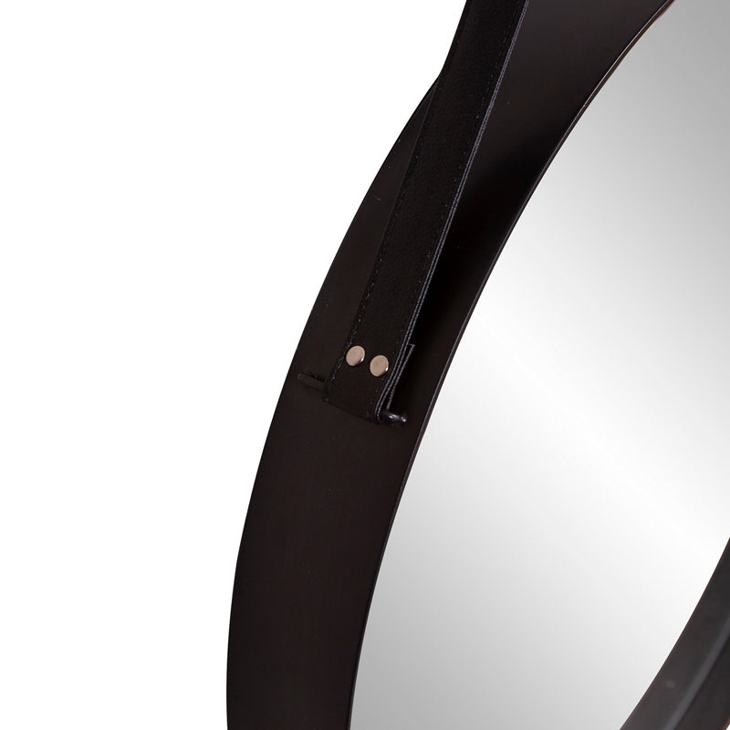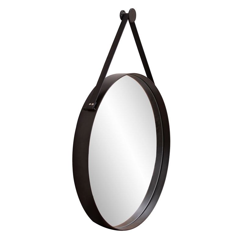 British explorers for years have inspired everything from furniture to accessories. Their adventures often referred to as campaigns has created a design sensation. A mirror was often part of these travels and featured a leather strap that could be used to hang it from the tent or a tree. Hence the inspiration for our Huntley Mirror. A round stainless steel frame finished in brushed black features a leather strap. A matching round hanging knob affixes to the wall. Mirror