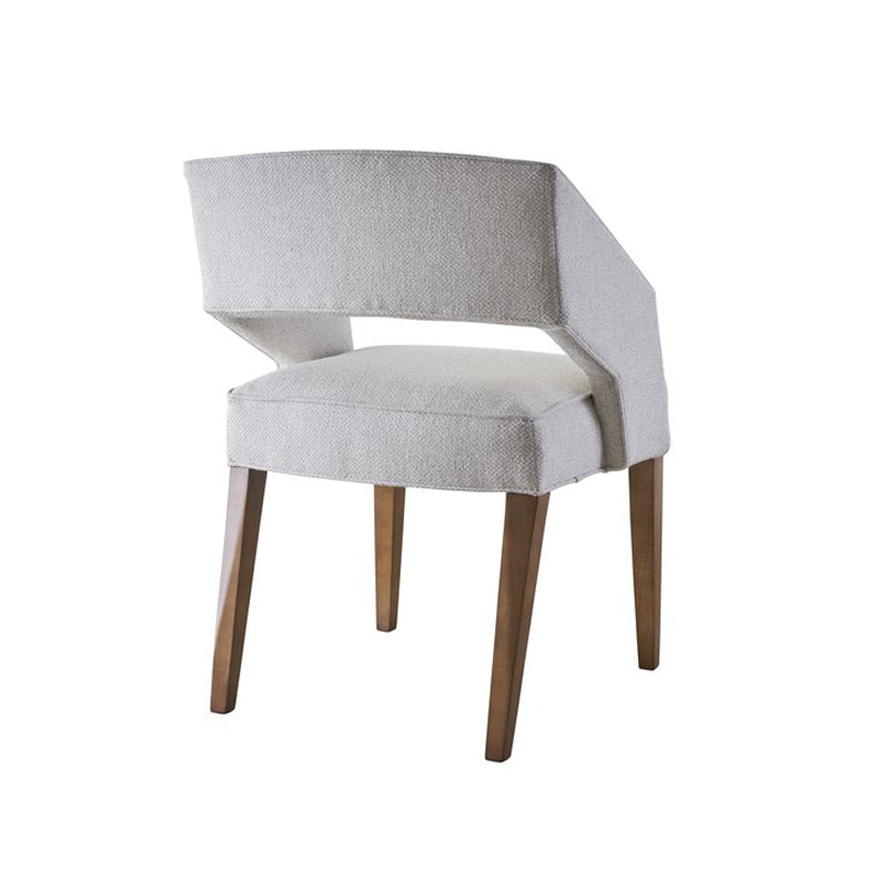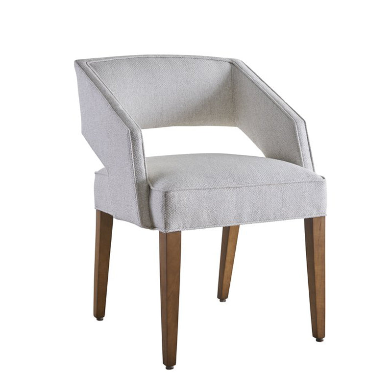 The Jasper chair is a modern open barrel back dining chair with exquisite upholstery details. Notice the chair back and arms are all one piece. The arms and back gently arch from the front of the chair to the top of the chair back. The arms and gently curved back are accentuated with a top border that is welted both inside and out. The opening between the chair back and seat give the appearance that the back is floating over the seat. Looking at the tightly upholstered seat, note it is bordered on all sides and framed with welt on the top and the bottom. The back of the seat has the same gentle curve as the chair back. Another unique detail to the Jasper chair is the rear tapered legs are chamfered at the outer side so as to keep the flow of the gentle curve of the seat. Straight tapered front legs complete this beautiful modern chair