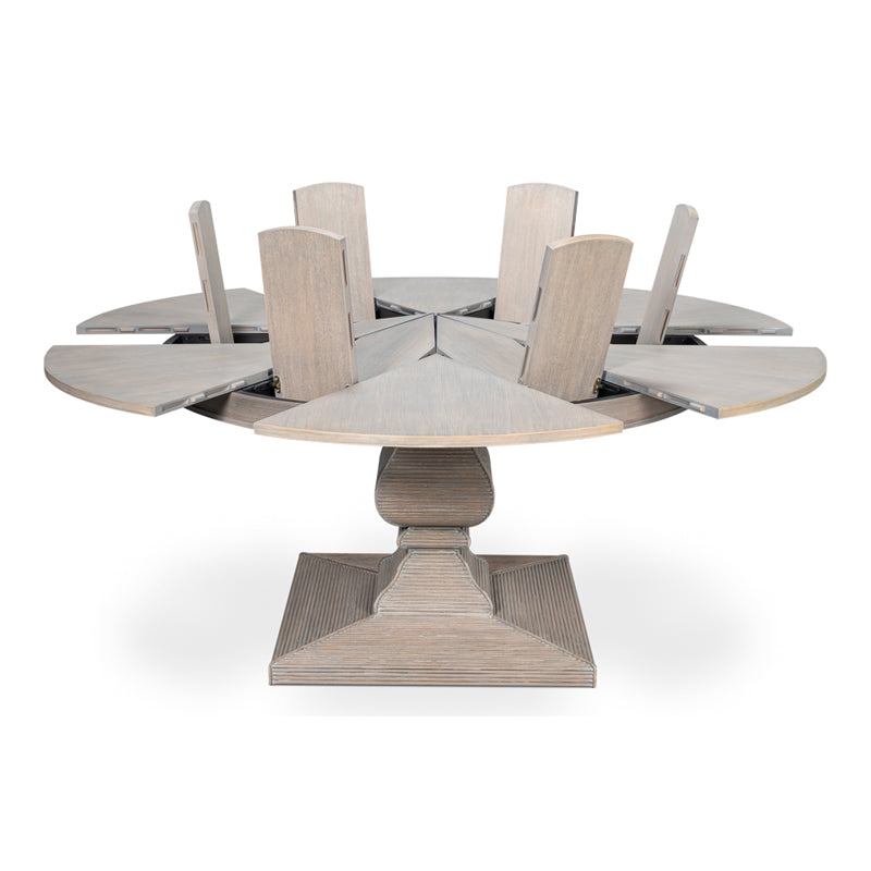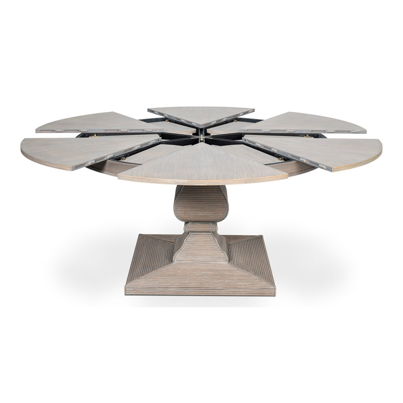 The Kelso Equestrian Jupe Table is a standout with the classically designed reeded and hand finished pedestal base, which makes it versatile enough to fit any design style. Featuring a self-storing expansion mechanism crafted from extruded aluminum , the top expands effortlessly, providing both smooth operation and simplified assembly.
