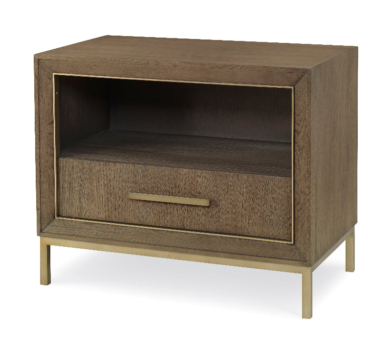 Camino Grey finish on Oak solids and veneer with Satin Gold finish metal trim and base. Single drawer with Satin Gold finish hardware below open storage