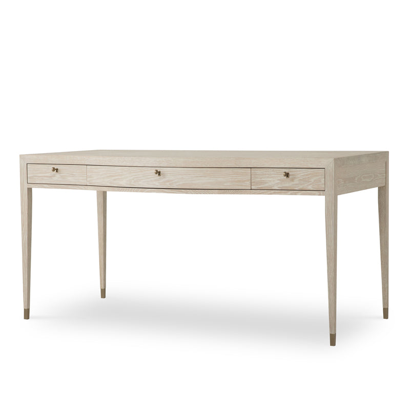 Natural cerused finish case with three drawers. Brass trim key with keyhole hardware. Brass finish ferrules