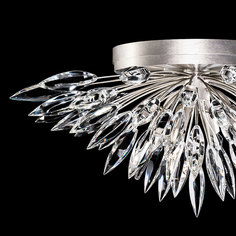 Flush mount in silver leaf finish with graceful bouquets of faceted crystal lily buds that create a naturally elegant lighting effect.