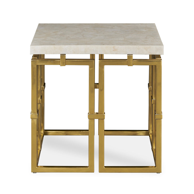 This beautiful statement lamp table was inspired by classic jewelry links. Open cast brass fretwork base with a floating top made of crystal stone quartz in warm ivory tones. Also available as a large cocktail, smaller cocktail, side table, martini table, console and desk.