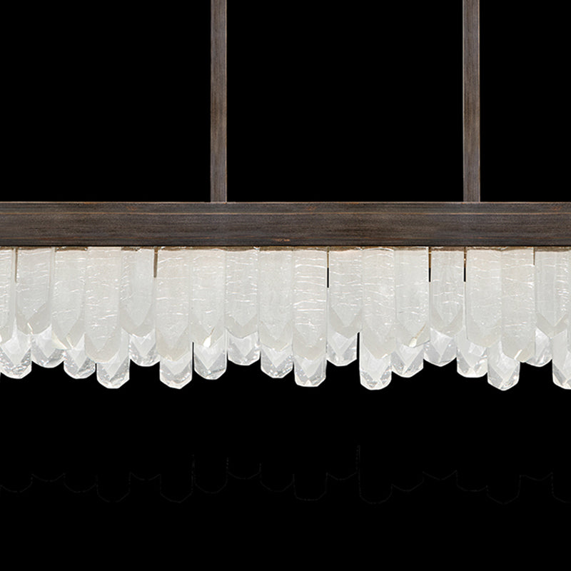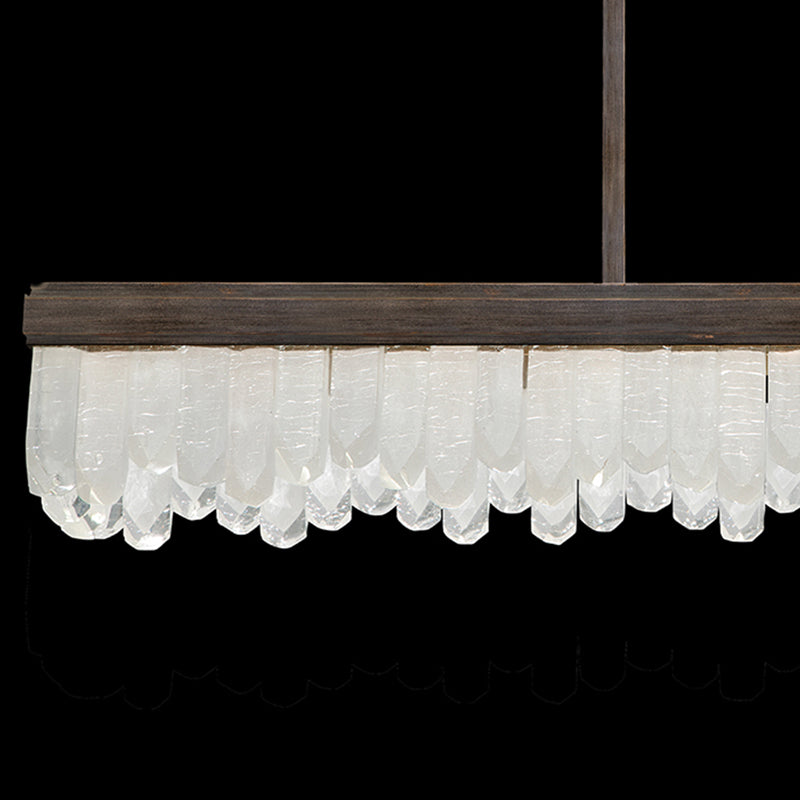 Rectangular LED pendant influenced by the ephemeral appearance of illuminated rock crystal, which has been interpreted into handmade glassworks with the collaboration of the Fine Art studio glass master craftsmen. Formed of glass spires that mimic natural crystal formations as much as they do rays of sunlight, and clean metal lines in unadorned but precious finishes. Available in silver leaf, gold leaf or patinated bronze.