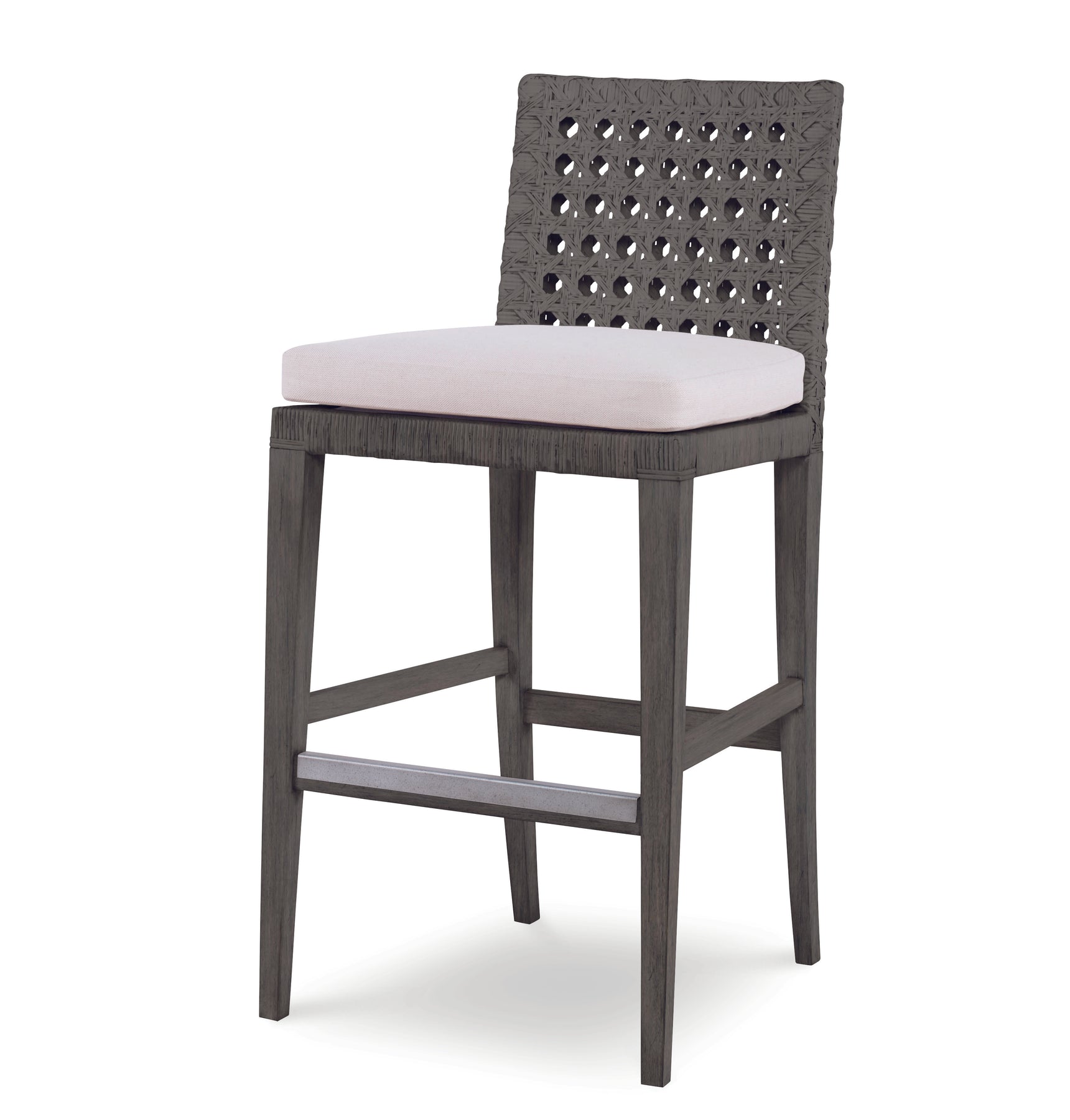 Our Litchfield bar stool is a classic silhouette, with pretty tapered legs and a simple square back and arms. Exceptional here as it is rendered in beautiful mahogany solids with open, woven peel caning all hand applied in a intricate pattern to form the back details. An upholstered seat in linen like flax colored fabric. Also available as dining arm and side chairs.