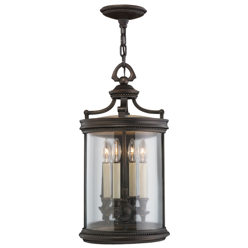 Lantern of aluminum in a fine bronze finish. Features clear hand-blown glass and antiqued candles.