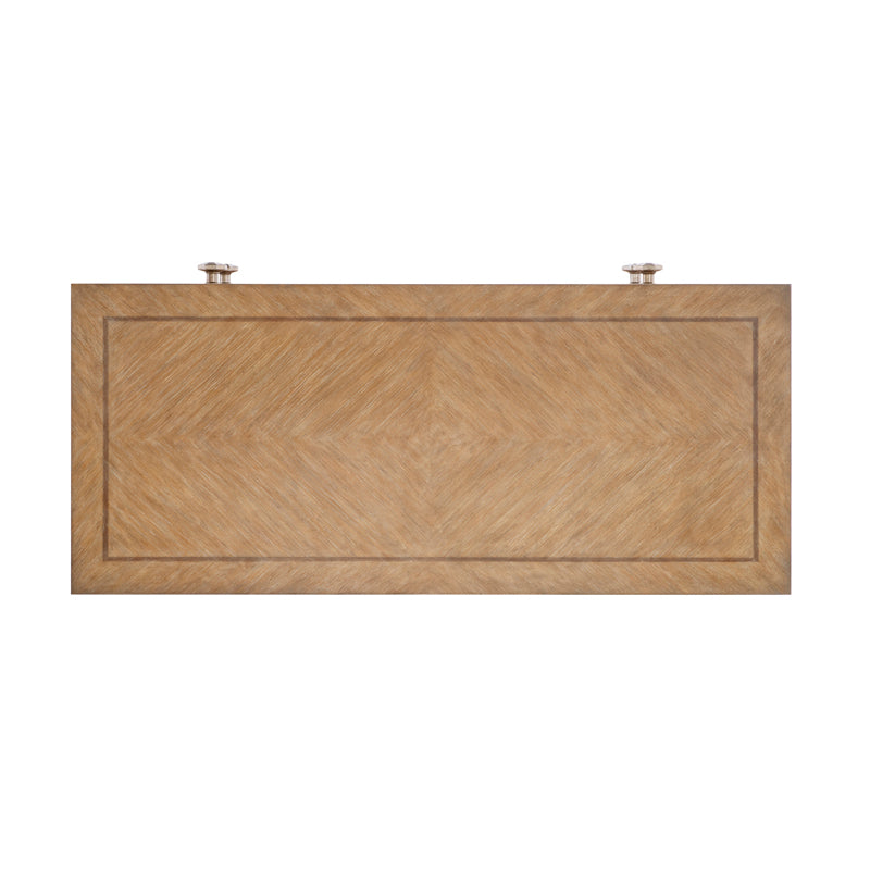 Cerused White Oak herringbone chest with Walnut stringer and custom octagonal hardware with a lightly antiqued finish. Two drawers.