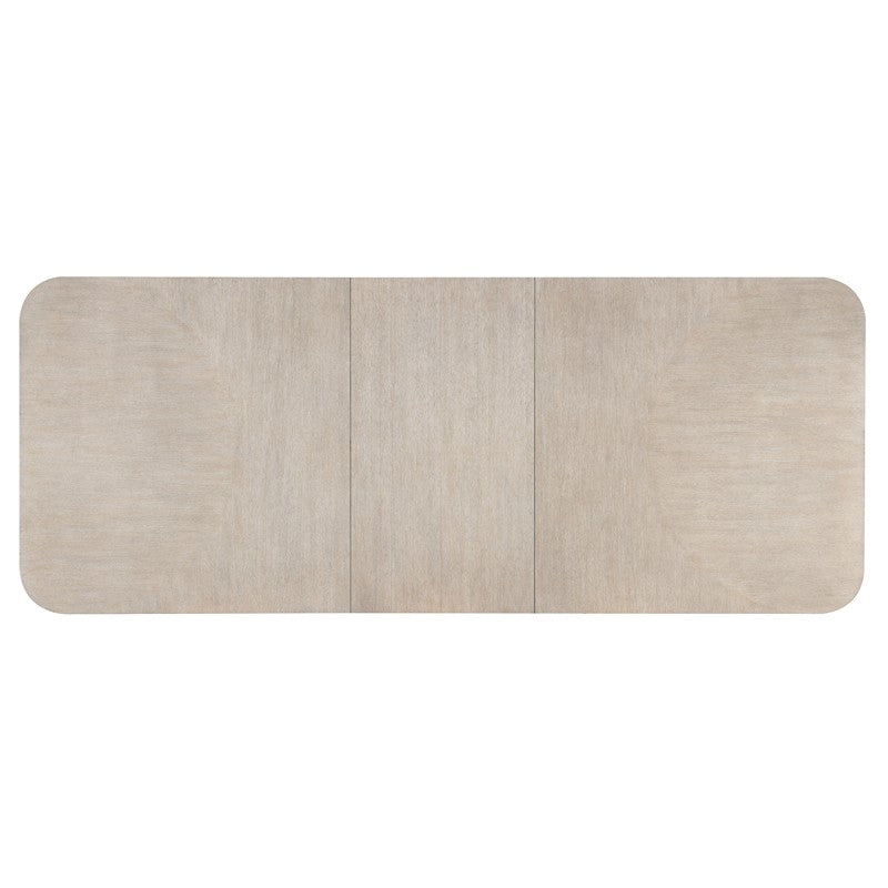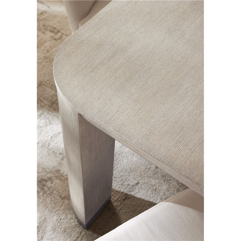 Inspired by decades of design movements with an unmistakably modern aesthetic that transcends time, the Modern Mood Leg Dining Table is a striking, softly sophisticated profile. Featuring a rounded table apron and corners, matched veneers on the top and metal banding accents on the legs in a warm pewter finish, it is crafted of Quartered Oak Veneers in a Diamond Finish with crystal-like alabaster hues. With one 24-inch leaf, the table extends up to 110 inches long.