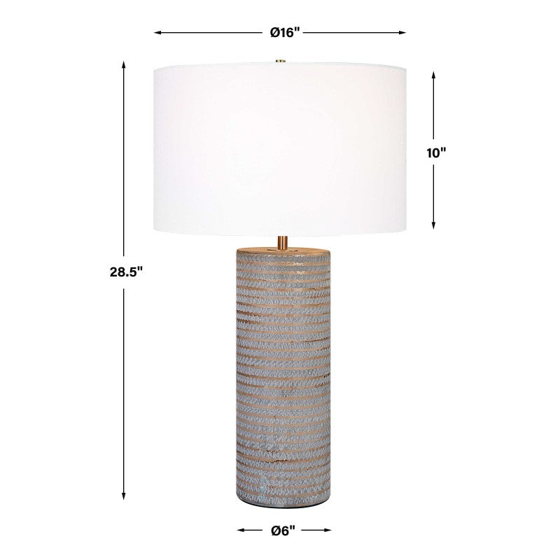 This Ceramic Table Lamp Showcases A Rustic Chiseled Texture With Frosted Pewter Gray Undertones And Organic Carved Accents In Light Sepia Tones. Iron Details Are Finished In Antique Brass. The Lamp Is Complimented By A White Fabric Drum Shade.