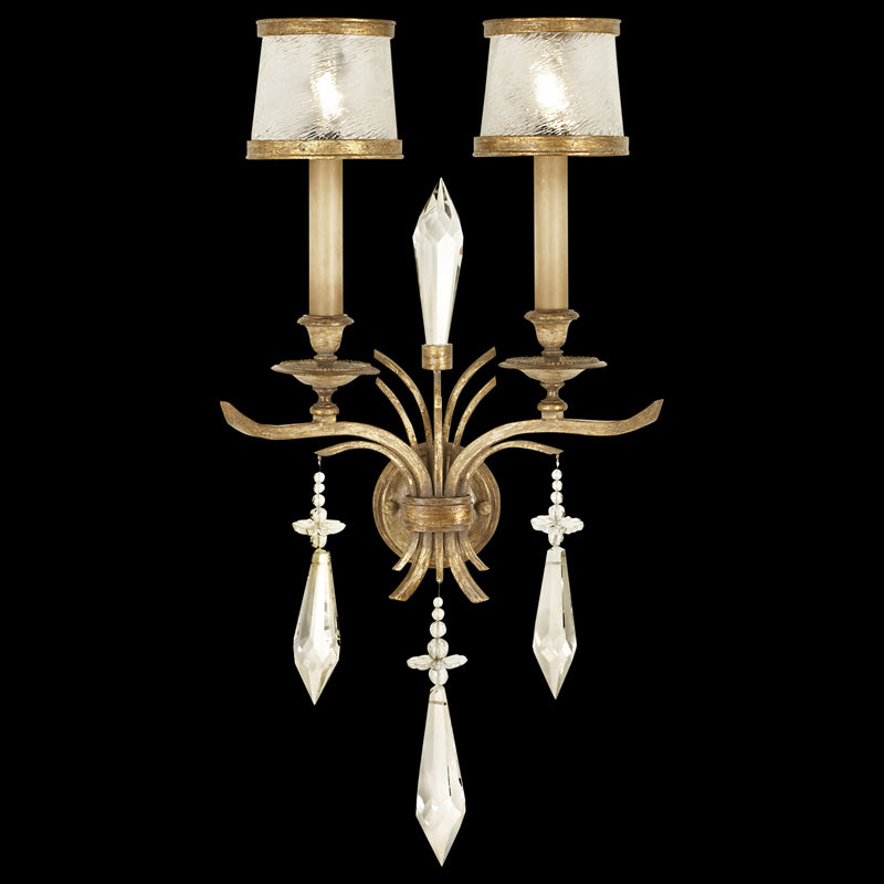 Sconce in gently worn gold leaf finish. Features brilliant crystal drops and hand blown swirled crystal shades in gilded frames.
