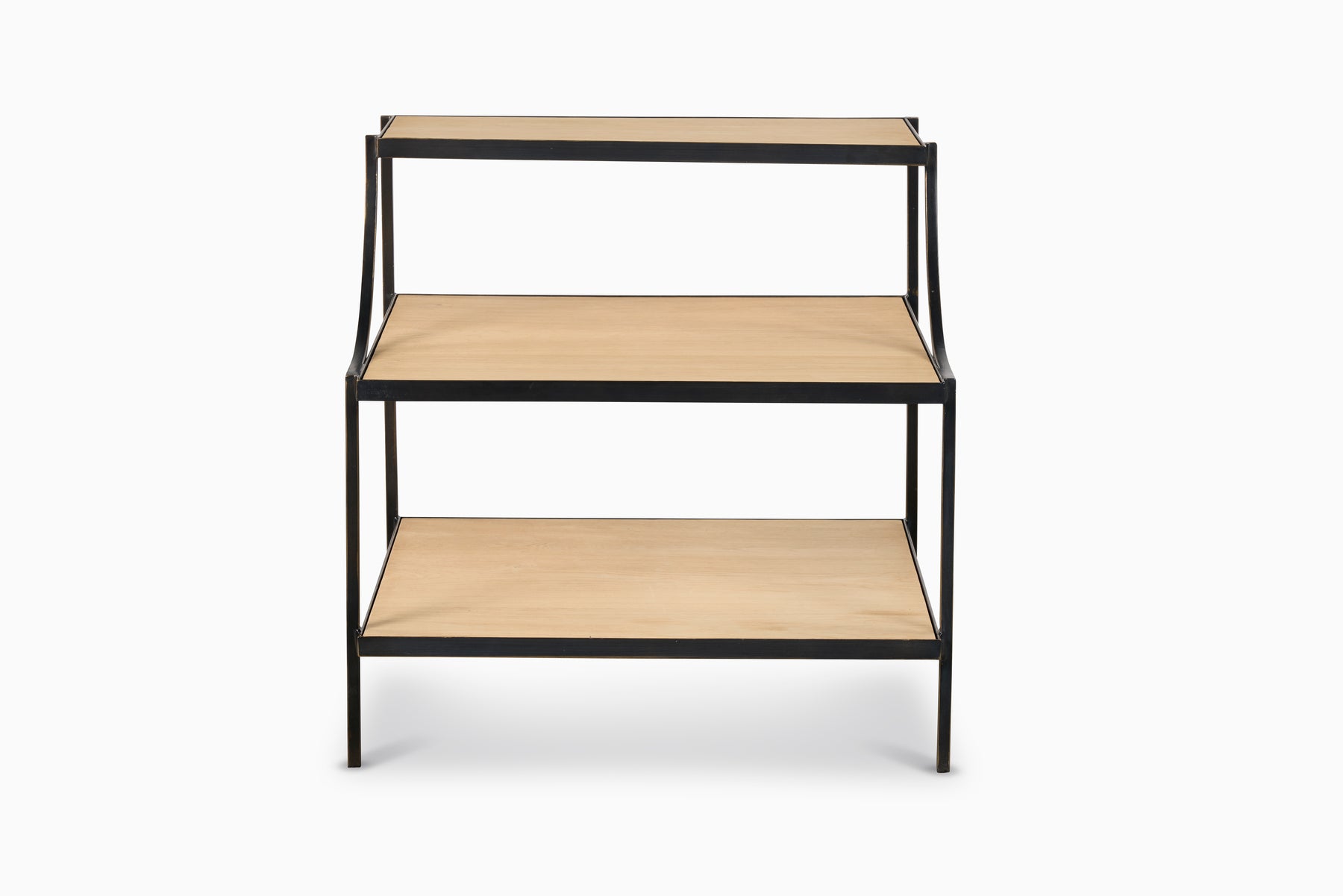 Oak solids and veneer shelves finished in a light, natural stain with bronze metal frame. Designed by Pride Sasser