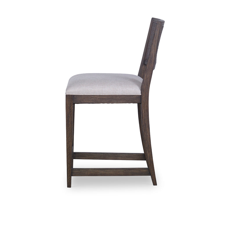 With it’s classic use of cane woven in a modern way, the Parker counter stool is a fresh traditional that fits with nearly any setting. Crafted of Oak solids and cane in a dark brown finish with textured linen upholstery. Available only as shown. Also available as Side and Arm dining chairs.
