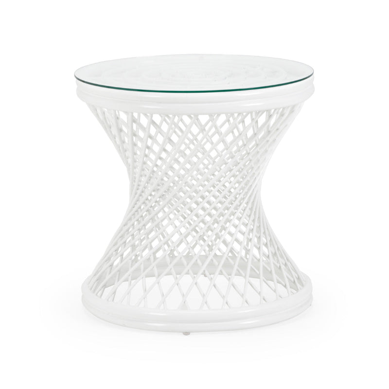 Round glass top rattan side table in white.