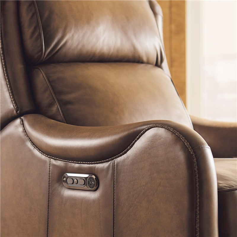 Swanky and stylish, the Carrington Power Recliner with Power Headrest and USB Port has a bustle style back, sloped arms and tapered wood legs in a dark finish. It is covered in a semi-aniline top grain luxurious leather called Nature.