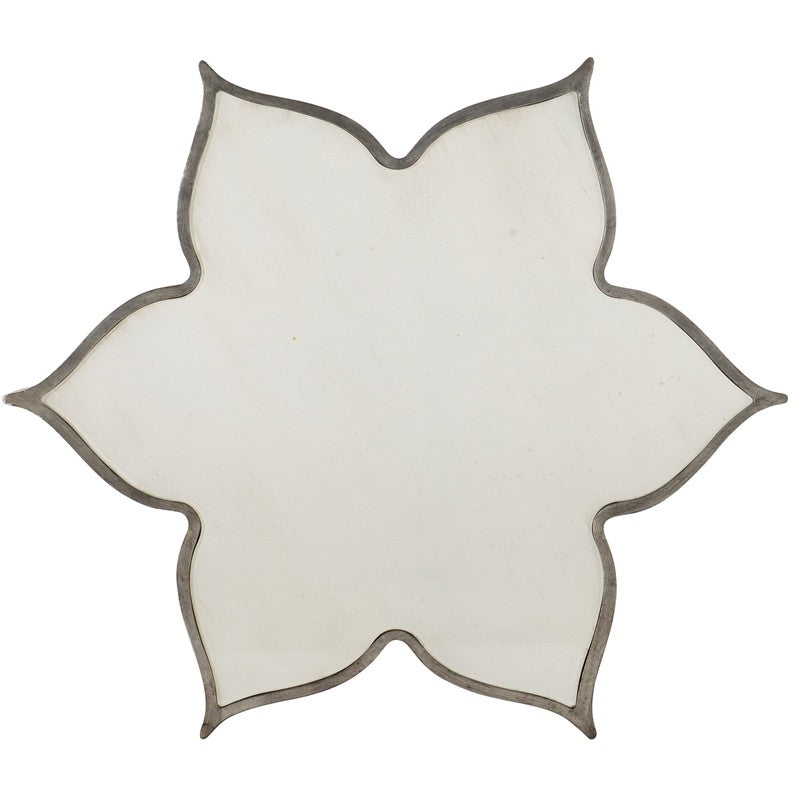 Like a Hollywood starlet, this exquisite flower-shaped cocktail table shimmering in a silver finish with undertones of gold and champagne will add beauty and drama to your room. The lovely top is finished in Meringue, a reverse painted glass in a creamy white finish. On casters for easy moving.