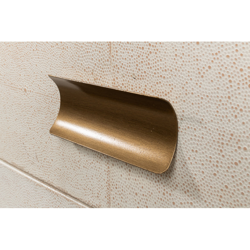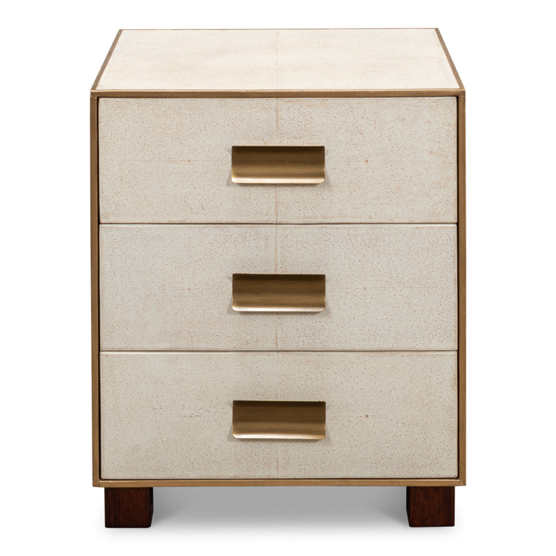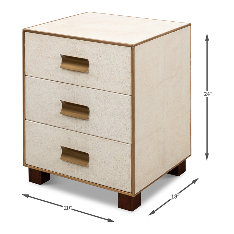 Elevate your love story with the Shagreen 3 Drawer Side Table in Osprey White. Crafted with gold leather trim, brass knobs, and contemporary style, it's the perfect setting for romance.