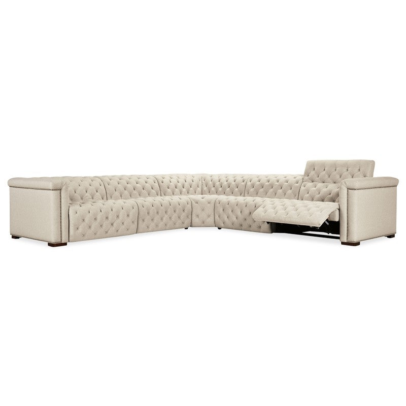 Upholstered in Aries Beach performance fabric, the Savion Deux 5 Seat Sectional offers four power recliners and six power headrests, creating the ultimate seating experience. The fabric’s smooth texture is paired with dark wood accents, chesterfield tufting, and copper-toned nail trim for a blend of comfort and timeless appeal. The discreet power reclining function adds modern convenience without compromising style.