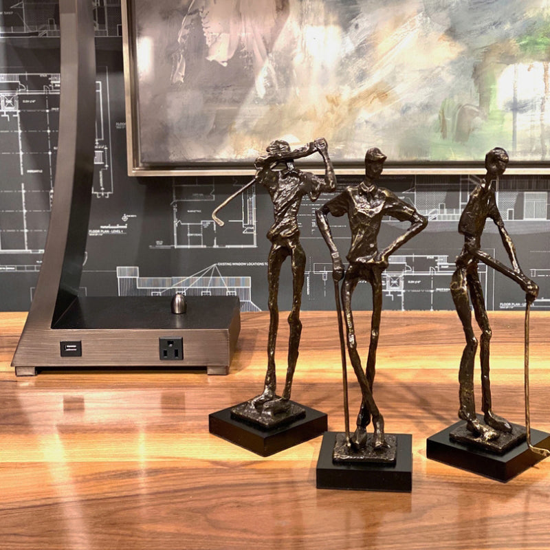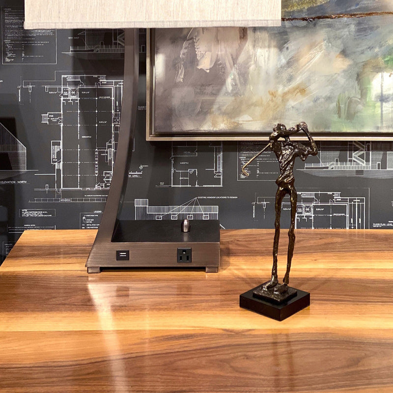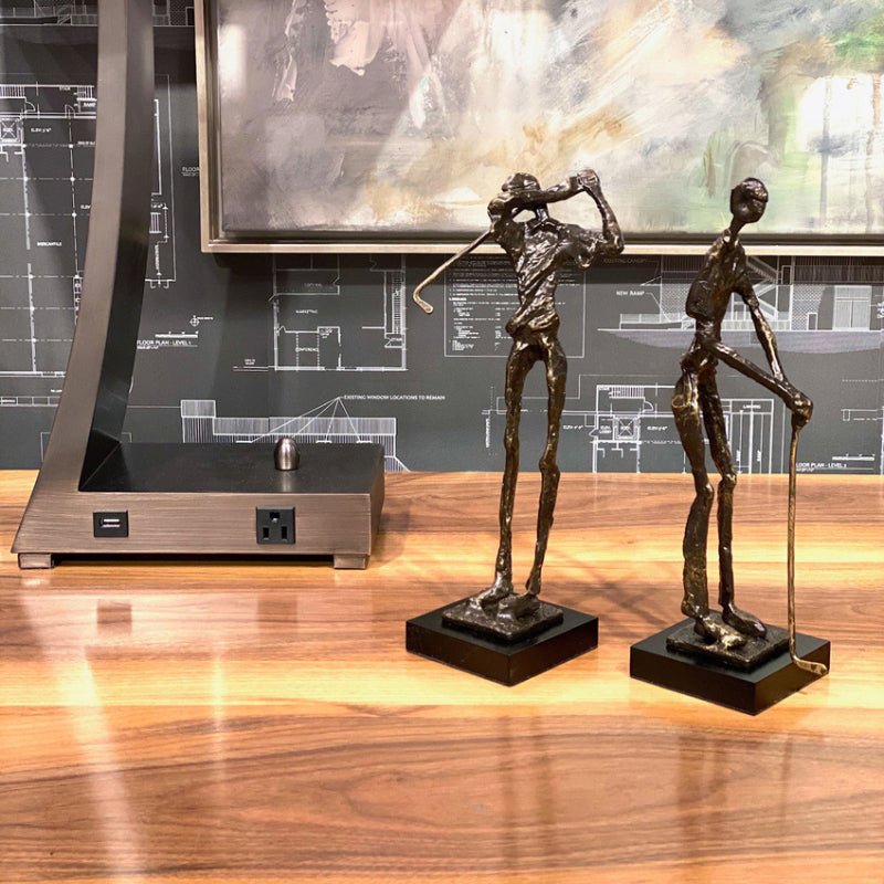 Fore! the golf lover... This old bronze finished cast alloy elongated figural sculpture of a Swinging Golfer makes a playful decorative accent for a library, den or office.