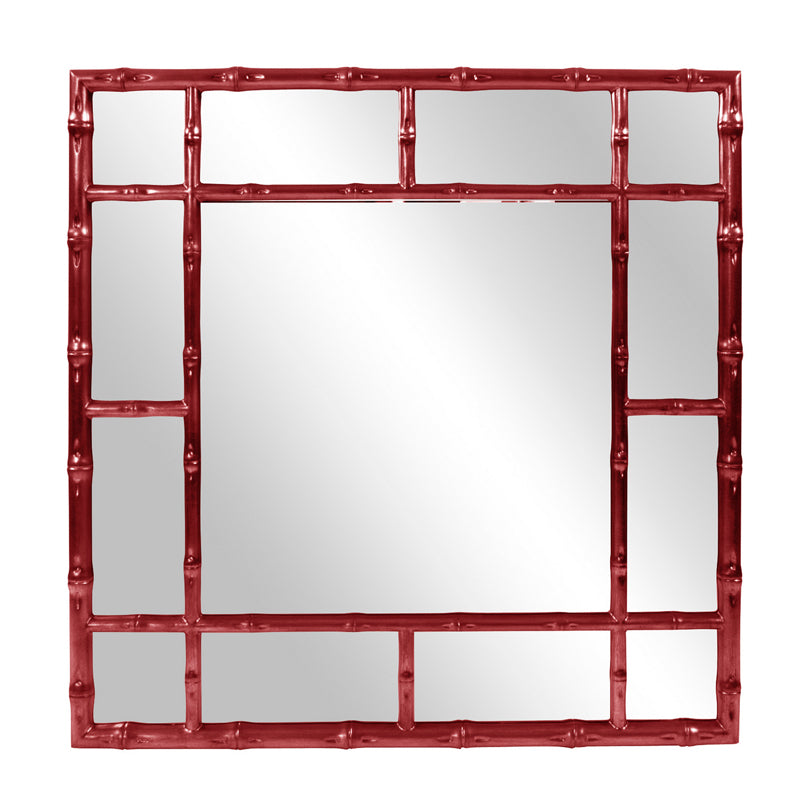 Our Bamboo Mirror features a square frame fashioned to look like bamboo rods. It is then finished in our glossy burgundy red lacquer. Its sleek style makes this mirror a favorite for bringing some flair to your decor. This simple yet stunning piece would be a great addition to any room. Alone or in multiples, it is a perfect focal point for an entryway, bathroom, bedroom or any room in your home. D-rings are affixed to the back of the mirror so it is ready to hang right out of the box in either a square or diamond orientation! The Bamboo Mirror is part of our custom paint program and is available in one of fourteen vivid colors. It is proudly painted in the USA. Mirror