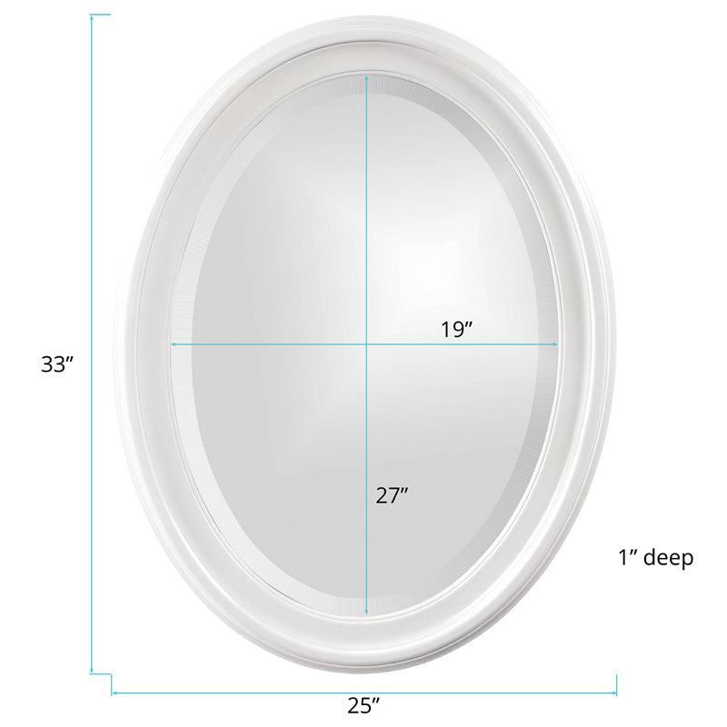 The George Mirror features a matte white lacquer finish. The oval frame is made from wood and is accented with grooves for added depth and character. For more added detail the mirror features a one inch bevel. Its Transitional style makes this mirror a favorite for bringing some flair to your decor. This simple yet stunning piece would be a great addition to any room. It is a perfect focal point for an entryway, bathroom, bedroom or any room in your home. D-rings are affixed to the back of the mirror so it is ready to hang right out of the box in either a horizontal or vertical orientation! Mirror
