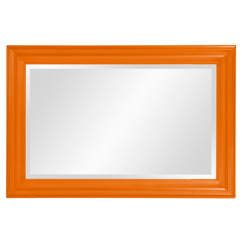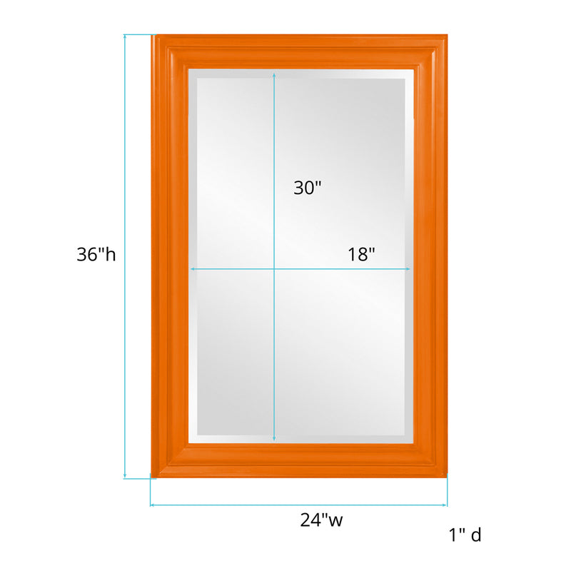 The George Mirror features our bold glossy orange lacquer finish. The rectangular frame is made from wood and is accented with grooves for added depth and character. For more added detail the mirror features a one inch bevel. Its Transitional style makes this mirror a favorite for bringing some flair to your decor. This simple yet stunning piece would be a great addition to any room. It is a perfect focal point for an entryway, bathroom, bedroom or any room in your home. D-rings are affixed to the back of the mirror so it is ready to hang right out of the box! The George Mirror is part of our custom paint program and is available in one of fourteen vivid colors. It is proudly painted in the USA. Mirror