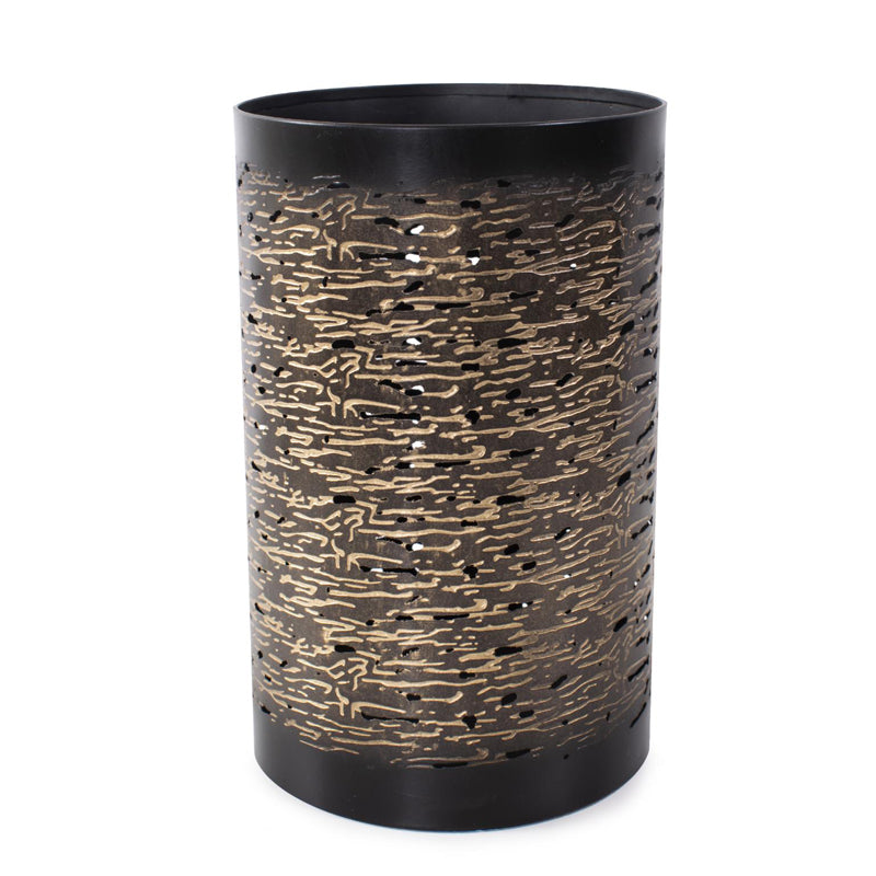 This vase boasts a matte black exterior with delicate light golden etchings adorning its surface, intricately woven like threads, creating a mesmerizing visual effect. These golden threads not only add depth and texture but also a touch of opulence to the vase's minimalist form. Whether displayed as a solo statement piece or paired with others in the collection to create a harmonious ensemble, this vase invites you to explore the play of light and shadow. Candleholder