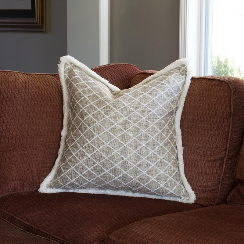 A delicate lattice design is woven into a rich natural basketweave on our Grille Natural Pillow. The classic design lends itself to any design setting. Our Grille Natural pillow is part of our Davida Kay designer pillow collection. Includes a lush down filled pillow insert and invisible zipper closure. Also available in a 20 size. Pillow