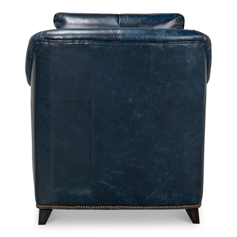 Vandike Armchair. This armchair features rich, Chateau Blue leather upholstery with a contrasting oak wood frame. Nail head trim along the edges add a touch of classic detail. The chair's comfortable design and elegant look, make it a versatile addition to living rooms or offices.