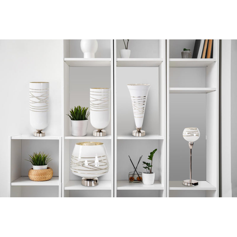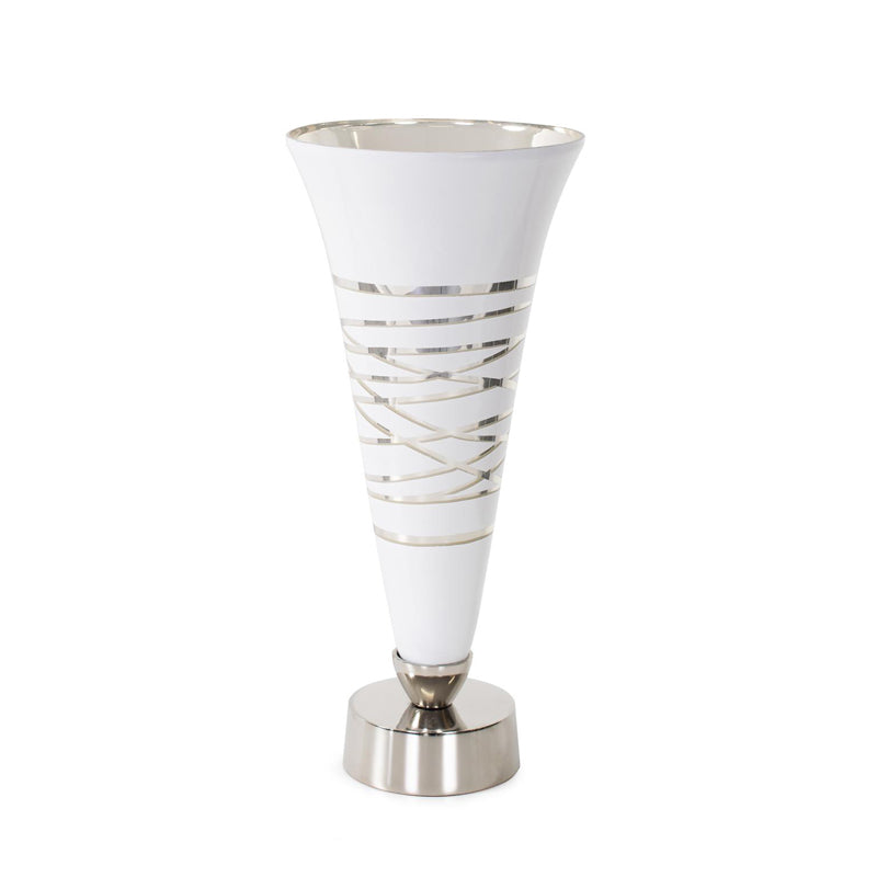 The Lustig Collection was inspired by the contemporary graphic designs of the late 60s and early 70s. Each of these hand crafted glass pieces feature a beautiful glossy white outer finish with highlights of arctic silver accents inside and out. Cast aluminum bases were added in a arctic silver to complete the overall look and design. Whether displayed in the complete collection or individually, these vessels will add a modern sophistication to any room. Vase