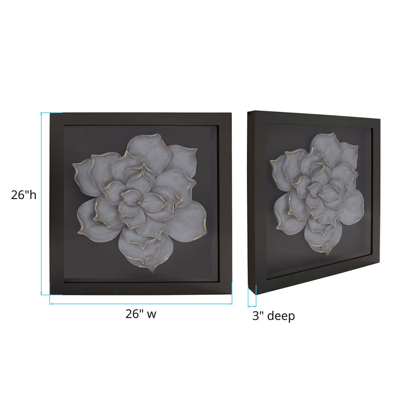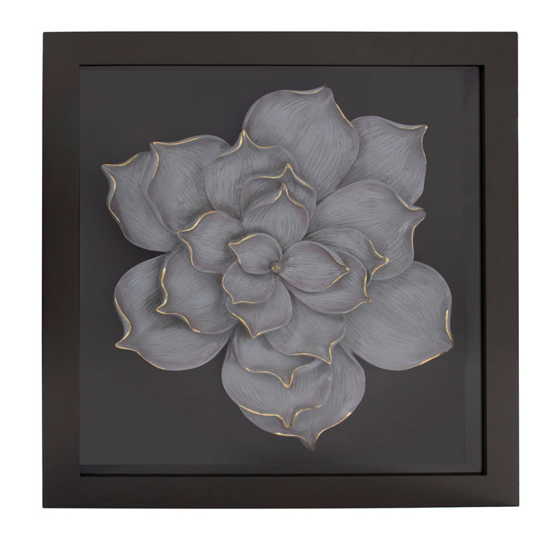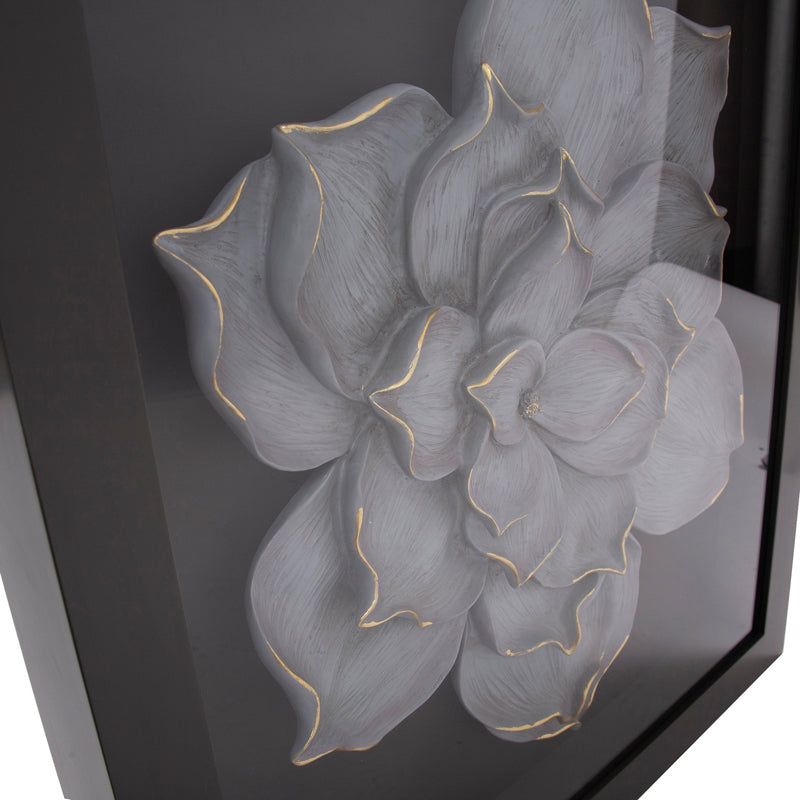 For centuries the art of creating small and large curio boxes of intriguing objects have been practiced. The translation of these curio boxes have now been raised to a new art form and are important elements in a room's design. This particular box features a large gray Magnolia Flower in a black wood shadow box frame. D-rings are affixed to the back of the frame so it is ready to hang right out of the box. Wall Art