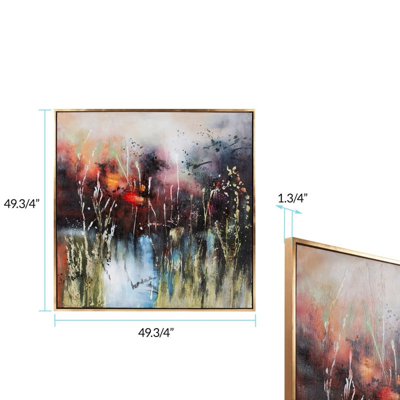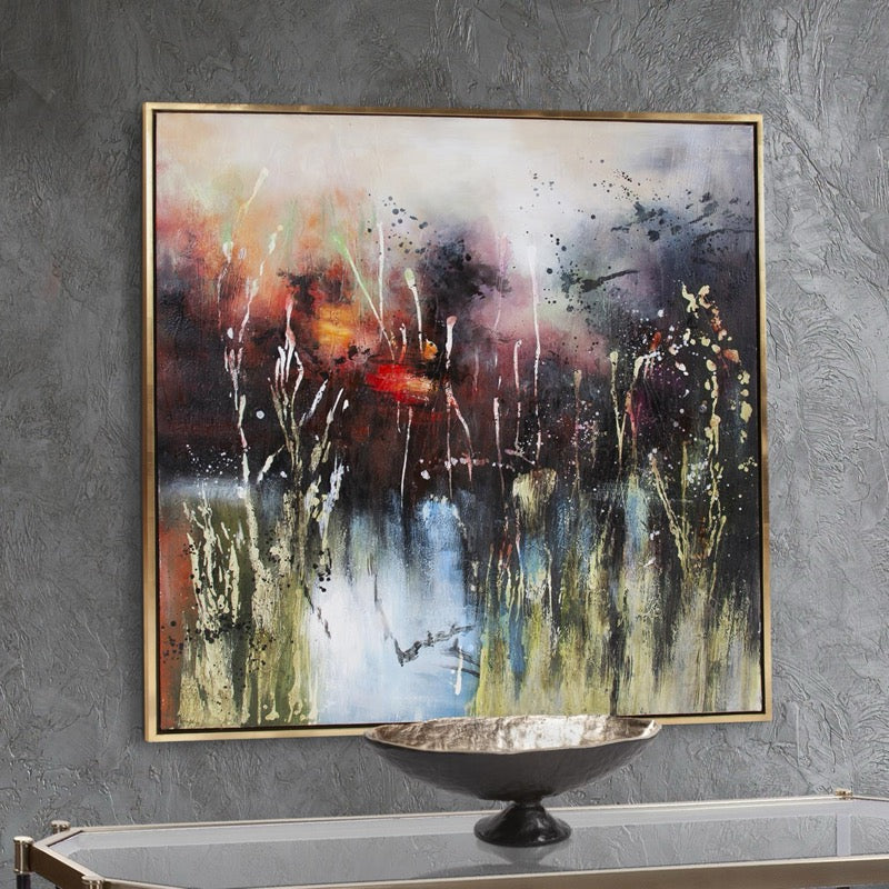 Fall at the farm meant long nature walks to take in all of the fall foliage. The woodlands to the meadows would suddenly take on the appearance of mother nature's colorful palette. Each color blending together so artistically that it seemed to be endless. Thick layers of paint are hand applied to create movement and texture. Because it is hand painted, no two pieces of art will be exactly the same. The gallery wrapped canvas is set into a floating gold leaf wood frame. Hardware is attached so the back of the art so that it is ready to hang right out of the box. Wall Art