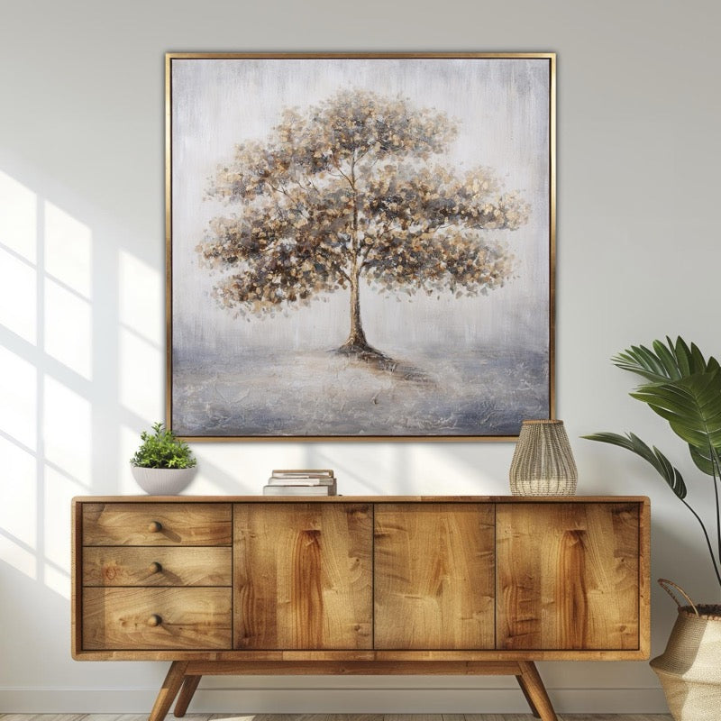 The inspiration for The Golden Oak was derived from an early morning walk in the local park one late fall day. We were all surprised to wake up that morning to see that the temperature had dropped over night and the heavy dew had turned into a light coating of ice. As I walked toward the park the huge mighty oak with it's golden fall foliage was covered over in ice and was seemingly glowing as the sun rose behind it. The whole tree as shimmering as if gold was dripping off each branch. Wall Art