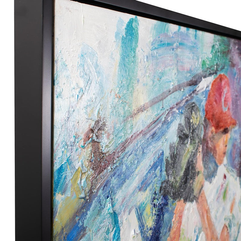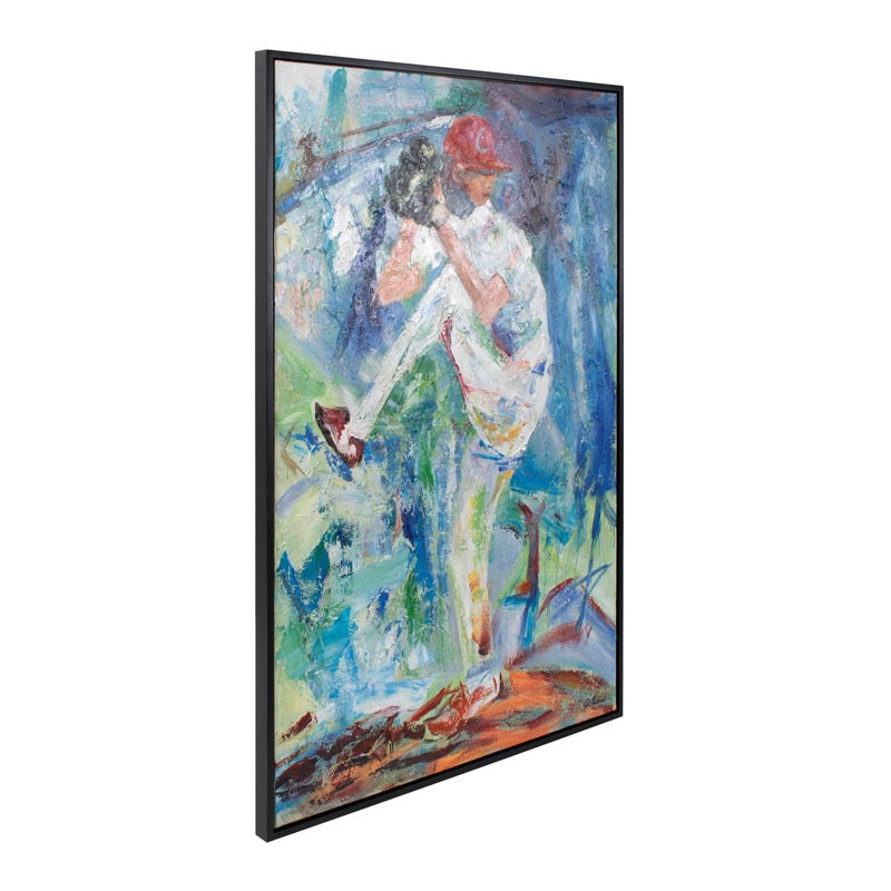 Inset in a sleek black floater frame, this captivating piece immerses you in the atmosphere of a baseball game, envisioning yourself at the iconic Wrigley Field. The dynamic brushstrokes and vivid details tell a beautiful story, capturing the essence of the pitcher's moment on the mound. Wall Art