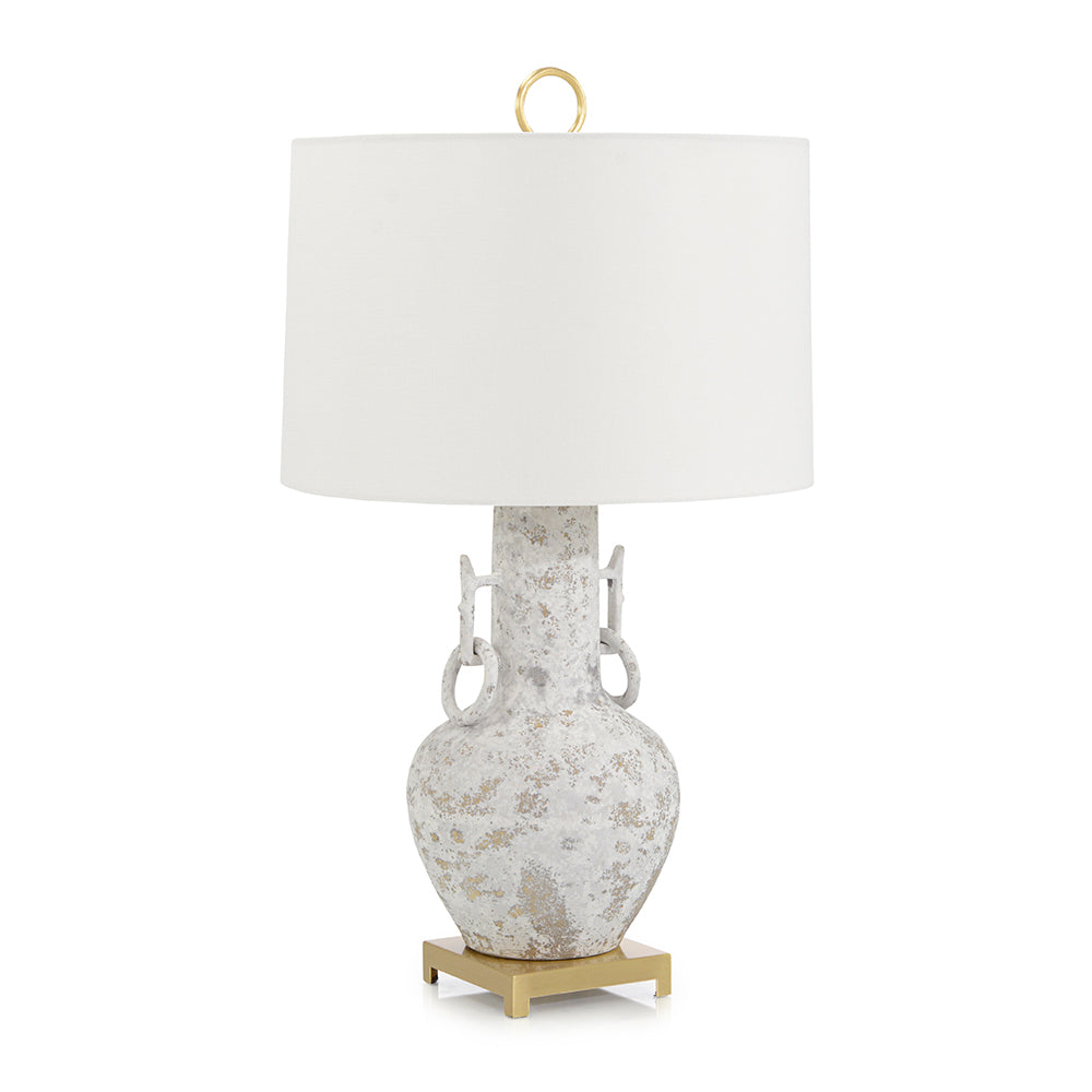The Whispering Mists Table Lamp showcases a unique retro look that is greatly elevated through rich, opulent tones. Featuring a porcelain body with a vase-like shape, the piece displays gorgeous curves and a misty white hue with an aged look. This lamp is held aloft with a square metal base in a Brushed Brass finish that is matched by a ringed finial at the top to complete the look.